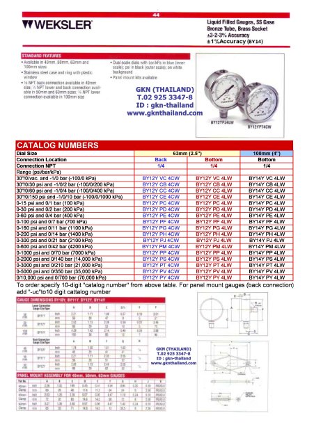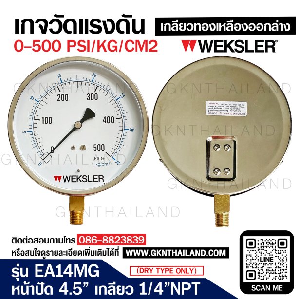 เกจวัดแรงดัน ยี่ห้อ "WEKSLER" รุ่น EA14MG แรงดัน 0-500 PSI & 0-35 KG/CM2 ขนาดหน้าปัทม์ 4.5" ตัวเรือนสแตนเลส304 เกลียวทองเหลือง 1/4"npt