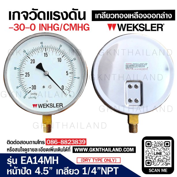 เกจวัดแรงดัน ยี่ห้อ "WEKSER" รุ่น EA14MH แรงดัน 30-0 INHG & -76-0 CMHG ขนาดหน้าปัทม์ 4.5" ตัวเรือนสแตนเลส304 เกลียวทองเหลือง 1/4"npt