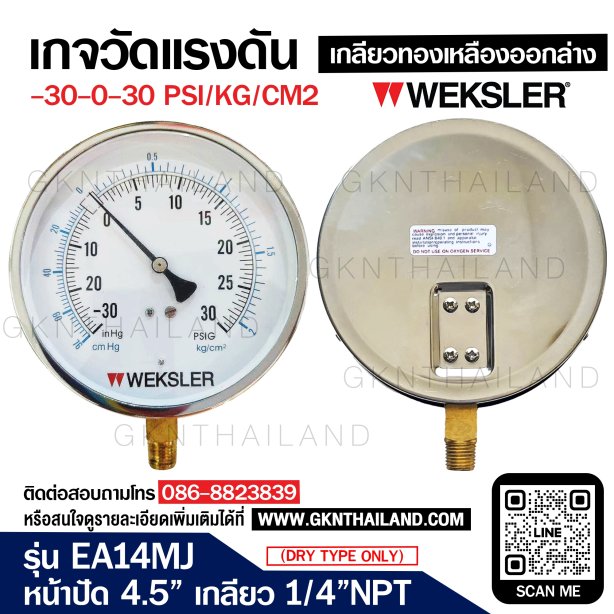 เกจวัดแรงดัน ยี่ห้อ "WEKSLER" รุ่น EA14MA แรงดัน 0-30 PSI & 0-2 KG/CM2 ขนาดหน้าปัทม์ 4.5" ตัวเรือนสแตนเลส304 เกลียวทองเหลือง 1/4"NPT