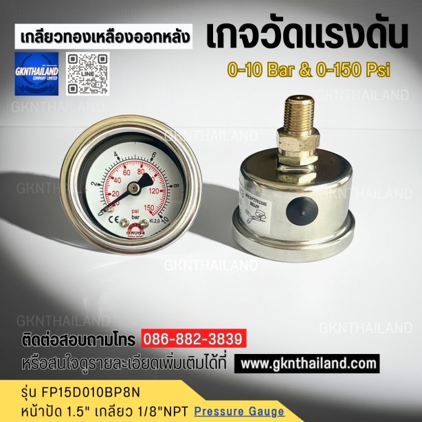 เกจวัดแรงดันยี่ห้อ Safegauge 0-10 บาร์ ตัวเรือนสแตนเลส ขนาดหน้าปัทม์ 1.5" เกลียวทองเหลืองออกหลัง 1/8"NPT