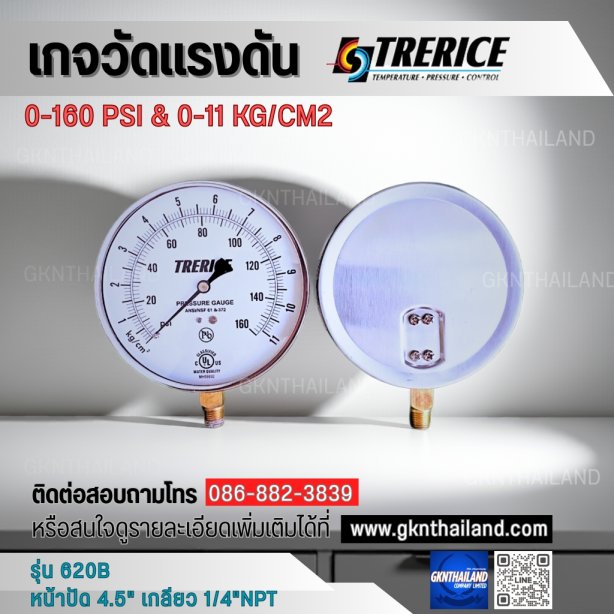 หน้าปัทม์ 4.5" เกลียวทองเหลืองออกล่าง 1/4" NPT RANGE : 0-160 PSI / 0-11 KG/CM2