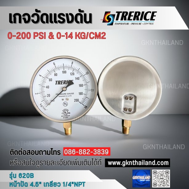 หน้าปัทม์ 4.5" เกลียวทองเหลืองออกล่าง 1/4" NPT RANGE : 0-200 PSI / 0-14 KG/CM2