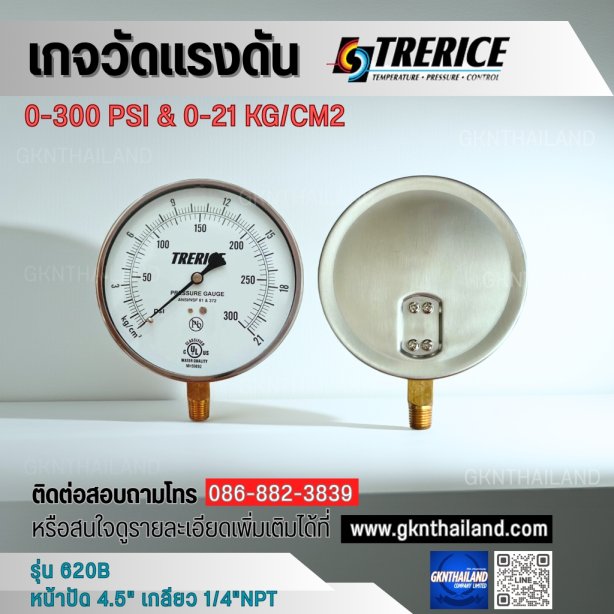 หน้าปัทม์ 4.5" เกลียวทองเหลืองออกล่าง 1/4" NPT RANGE : 0-300 PSI / 0-21 KG/CM2