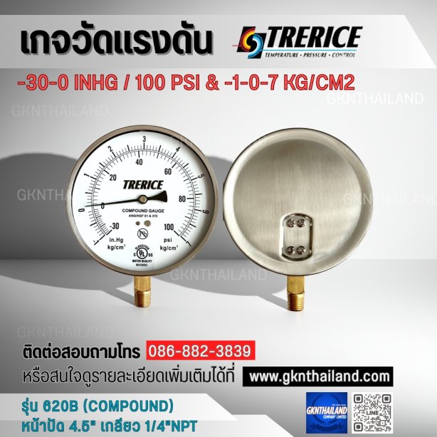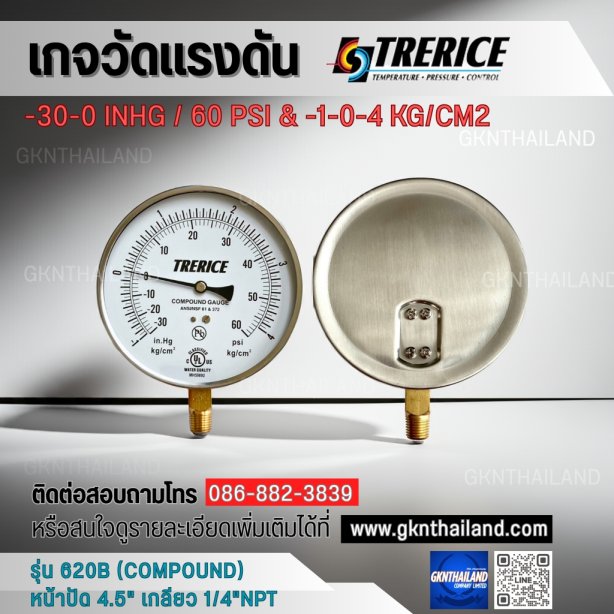 หน้าปัทม์ 4.5" เกลียวทองเหลืองออกล่าง 1/4" NPT RANGE : -30-0-60 PSI / -30 INHG-0-4 KG/CM2