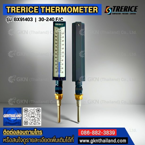เทอร์โมมิเตอร์แบบปรับได้ ยี่ห้อ "TRERICE" รุ่น BX91403-47 ช่วงการวัดอุณหภูมิ 30-240 องศาฟาเรนไฮต์ 0-115 องศาเซลเซียส ตัวปรอทยาว 9 นิ้ว ก้านวัดยาว 3.5 นิ้ว