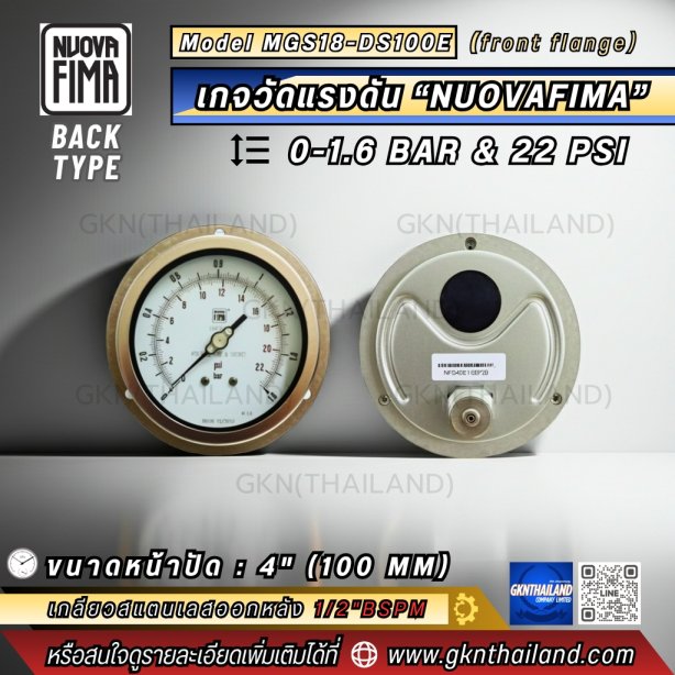 4 นิ้ว 0-1.6 BAR [0-22 PSI] เกลียวสแตนเลสออกหลังมีปีก 1/2"BSP