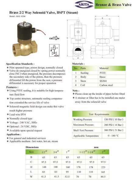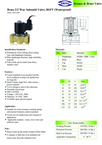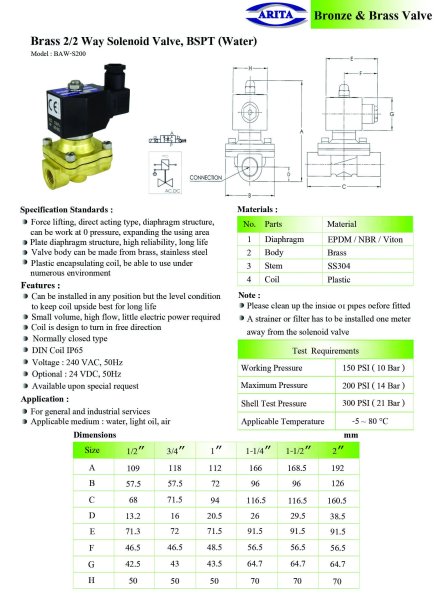 โซลินอยด์วาล์วขดลวดแม่เหล็กไฟฟ้า ARITA รุ่น BAW‑S200 (ใช้น้ำ) ประเภท: วาล์วแบบ 2 ทาง (2/2 Way) คือมี 2 ช่องและ 2 ตำแหน่ง (เปิด-ปิด)