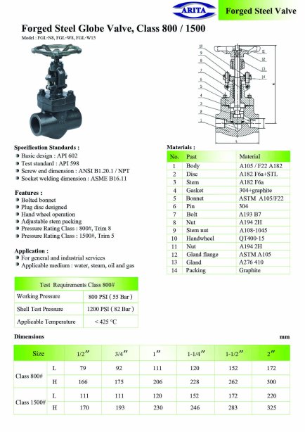 Arita Forged Steel Globe Valve, Class 800PSI & 1500PSI