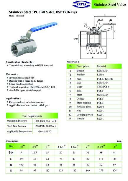 Arita Stainless Steel 1PC Ball Valve, BSPT (Heavy)