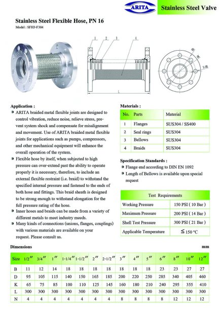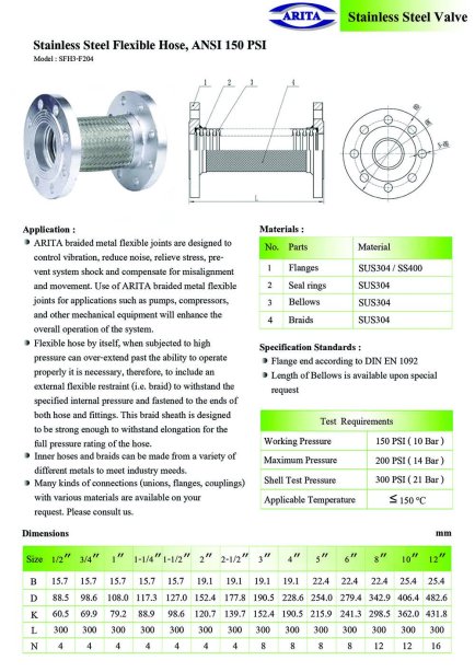 ท่อยางสแตนเลสถักแบบยืดหยุ่น (Flexible Metal Hose) จากแบรนด์ Arita ที่ออกแบบมาสำหรับระบบท่อในงานอุตสาหกรรมทั่วไป โดยสามารถทนแรงดันสูงสุดได้ที่ 150 PSI ตามมาตรฐาน ANSI (American National Standards Institute)