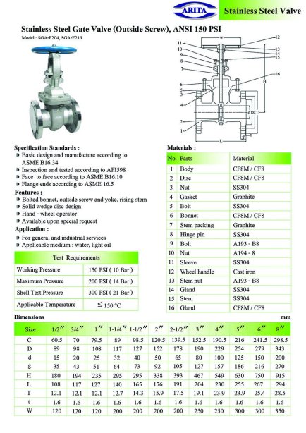 ARITA Stainless Steel Gate Valve (OS&Y), ANSI 150 PSI