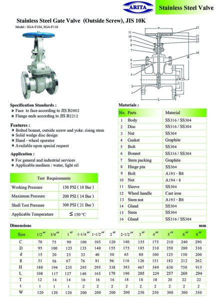Arita Stainless Steel Gate Valve (OS&Y), JIS 10K