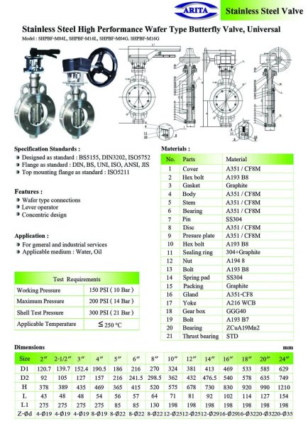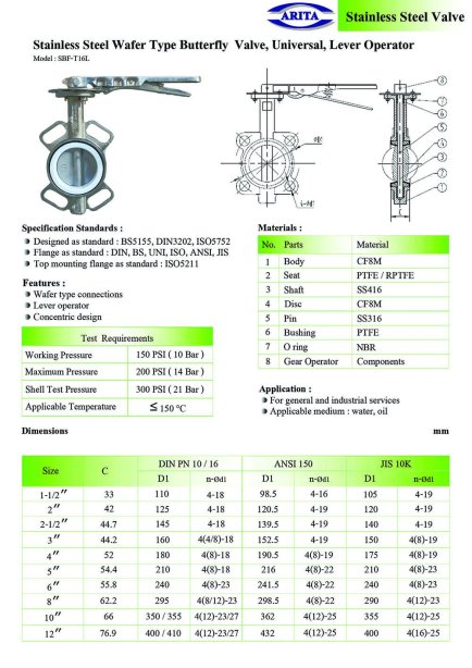 วาล์วผีเสื้อแบบหูหนีบ (Wafer Type) สแตนเลส – รุ่น Universal ยี่ห้อ Arita วาล์วผีเสื้อแบบ Wafer (หูหนีบ) วัสดุ: สแตนเลสทั้งตัววาล์วและแผ่นดิสก์