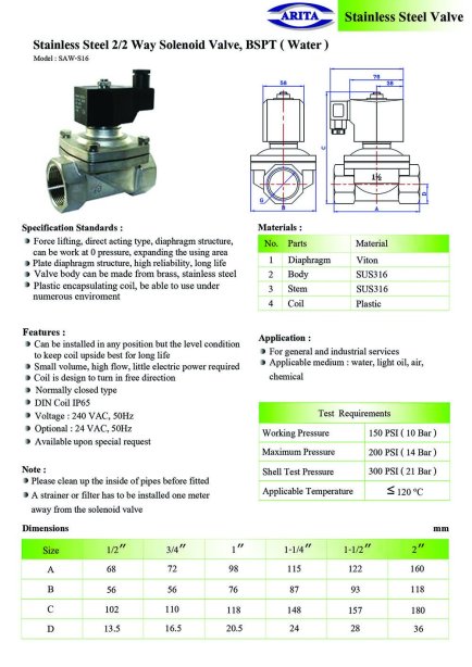 โซลินอยด์วาล์วสแตนเลส) ARITA วัสดุ สแตนเลส (Stainless Steel 304 หรือ 316 ขึ้นกับรุ่น) เกลียว แบบ BSPT (British Standard Pipe Taper)