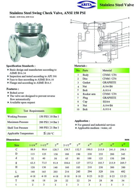 Swing Check Valve (วาล์วกันกลับแบบแผ่นบานพับ) แบรนด์: Arita วัสดุ: Stainless Steel