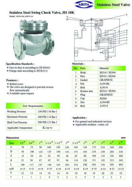 วาล์วเช็คแบบสวิง (Swing Check Valve) รุ่น Arita Stainless Steel Swing Check Valve, JIS 10K เป็นวาล์วกันย้อนกลับชนิดหนึ่งที่ทำจาก สแตนเลสสตีล