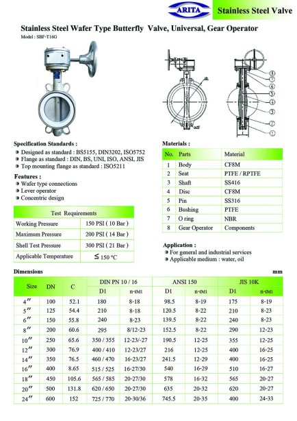 Arita Stainless Steel Wafer Type Butterfly Valve, Gear Operator, Universal