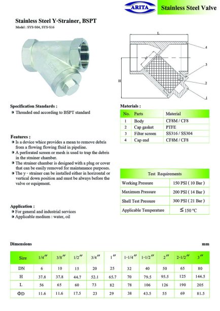 Arita Stainless Steel Y-Strainer วัสดุ: Stainless Steel (SS304 หรือ SS316) ประเภทเกลียว: BSPT (British Standard Pipe Taper Thread)