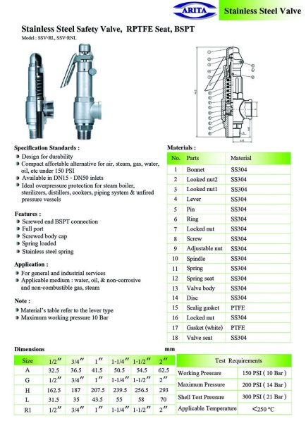 Arita Stainless Steel Safety Valve, RPTFE Seat, BSPT