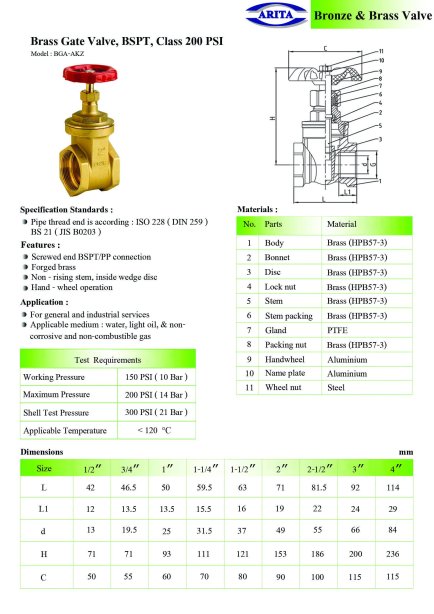 วาล์วประตูทองเหลือง Arita รุ่น BGA-ASW ชนิดเกลียว: BSPT (British Standard Pipe Taper) แรงดันรองรับ: Class 200 PSI วัสดุ: ทองเหลืองคุณภาพสูง (Brass)