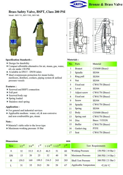 วาล์วนิรภัยทองเหลือง ยี่ห้อ Arita (Arita Brass Safety Valve) เกลียว BSPT (British Standard Pipe Taper) แรงดันใช้งาน (Pressure Rating): Class 200 PSI