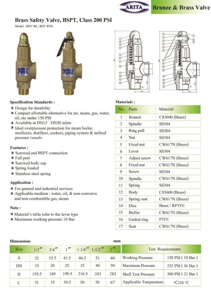 วาล์วนิรภัย (Safety Valve) ยี่ห้อ Arita วัสดุ: ทองเหลือง (Brass) เกลียวต่อ: BSPT (British Standard Pipe Tapered) แรงดันสูงสุด: Class 200 PSI (ประมาณ 13.8 บาร์) ซีล (Seat): PTFE (Polytetrafluoroethylene – ทนเคมีสูง) อุณหภูมิการใช้งานสูงสุด: 210 °C