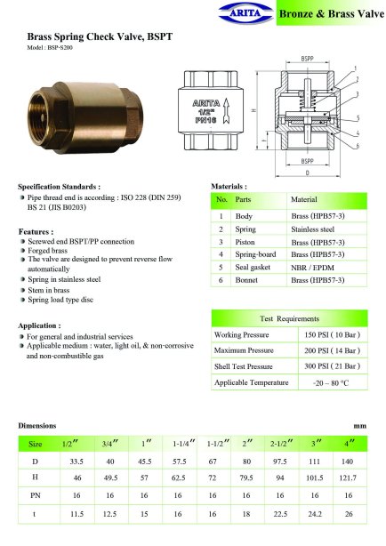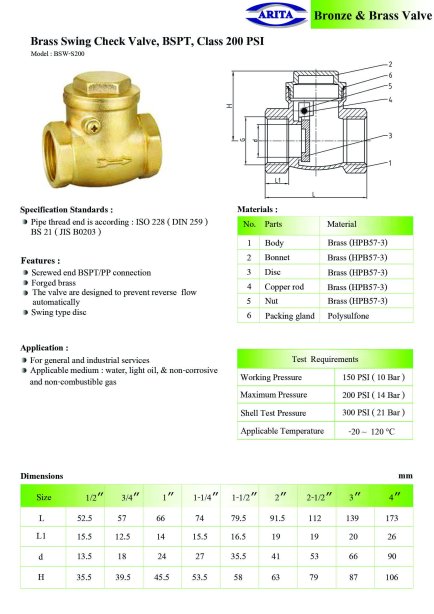 วาล์วกันกลับแบบสวิงทองเหลือง Arita, เกลียว BSPT, แรงดันใช้งาน 200 psi
