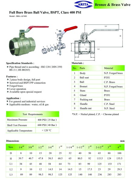 Arita Full Bore Brass Ball Valve รุ่น AF400 บอลวาล์วทองเหลือง ARITA แบบ Full Bore รุ่น AF400 รุ่น: AF400 วัสดุ: ทองเหลือง (Brass) ชนิดรูวาล์ว: รูเต็ม (Full Bore)