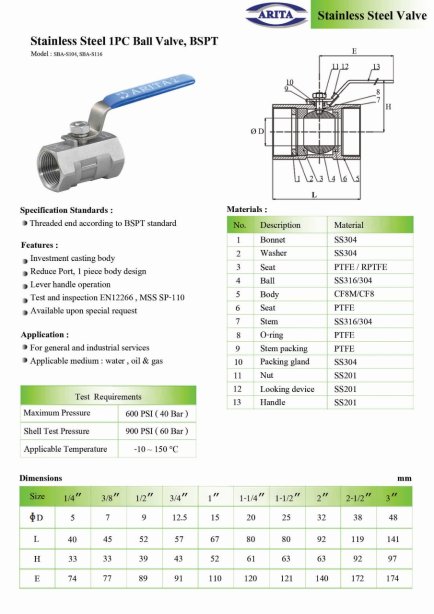 บอลวาล์วสแตนเลส Arita พร้อมแป้นยึดสูง (High Mounting Pad) เกลียว BSPT (British Standard Pipe Tapered – เกลียวเฉียงตามมาตรฐานอังกฤษ)