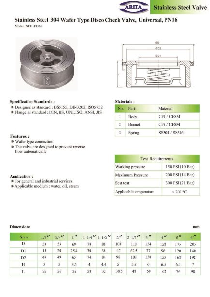 Arita Stainless Steel 304 Wafer Check Valve รุ่น Universal เป็นวาล์วกันกลับแบบแผ่น (Wafer Type) ผลิตจาก สแตนเลสเกรด 304 (SUS 304)