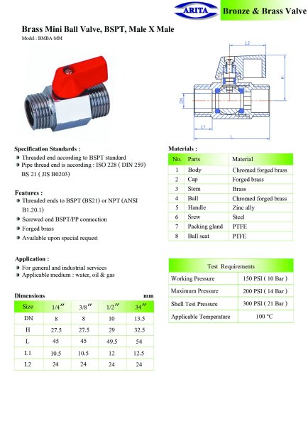 Arita Full Bore Brass Ball Valve AF600 Ball Valve (วาล์วลูกบอล) เกลียว: BSPT (British Standard Pipe Taper) วัสดุ: ทองเหลือง (Brass)