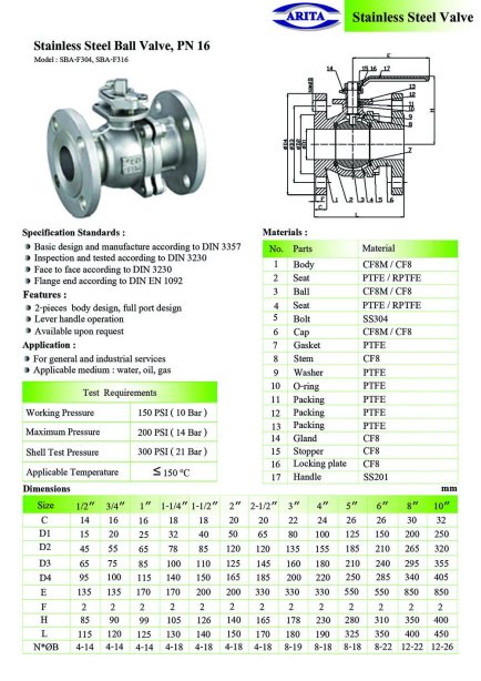 Arita บอลวาล์วสแตนเลส พร้อมแท่นติดตั้งสูง (High Mounting Pad) มาตรฐานหน้าแปลน ANSI 150 PSI วัสดุตัวเรือน: สแตนเลส (SS316 หรือ SS304 แล้วแต่รุ่น)