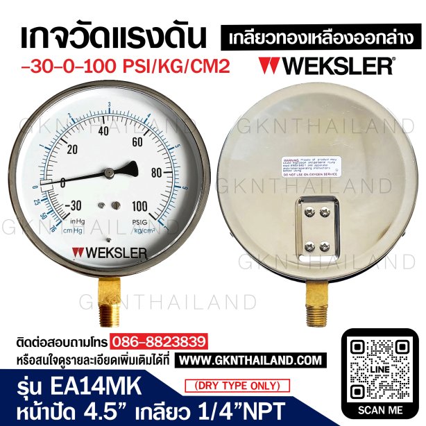 เกจวัดแรงดัน ยี่ห้อ "Weksler" รุ่น EA14MH แรงดัน 30-0 inhg & -76-0 cmhg ขนาดหน้าปัทม์ 4.5" ตัวเรือนสแตนเลส304 เกลียวทองเหลือง 1/4"npt