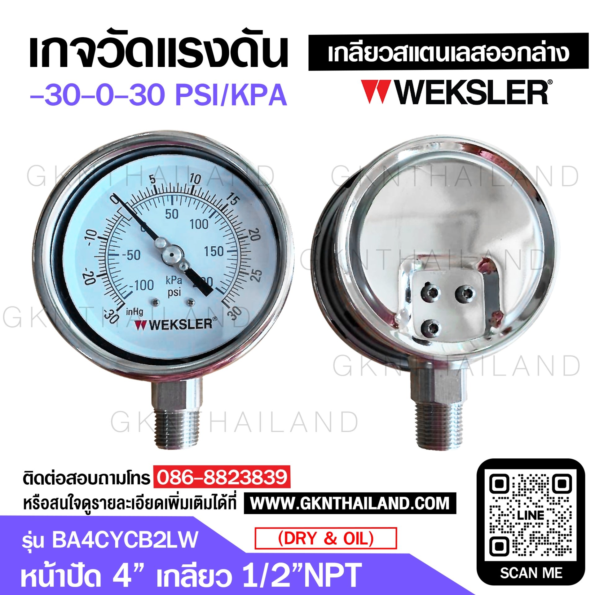 คอมปาวด์เกจ ยี่ห้อ "WEKSLER" รุ่น BA4CYCB2LW RANGE : -30-0-30 PSI & -100-0-200 KPA ขนาดหน้าปัทม์ 4" ตัวเรือนสแตนเลส304 เกลียวสแตนเลส 1/2"NPT